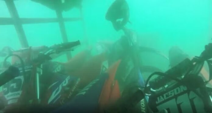 A balsa de pequeno porte que transportava trilheiros e motocicletas está no fundo do Rio Tocantins ainda com os veículos. Um mergulhador da equipe dos Bombeiros conseguiu chegar ao local e fez imagens subaquáticas do ponto onde aconteceu o naufrágio. Dois homens que estavam no barco morreram.