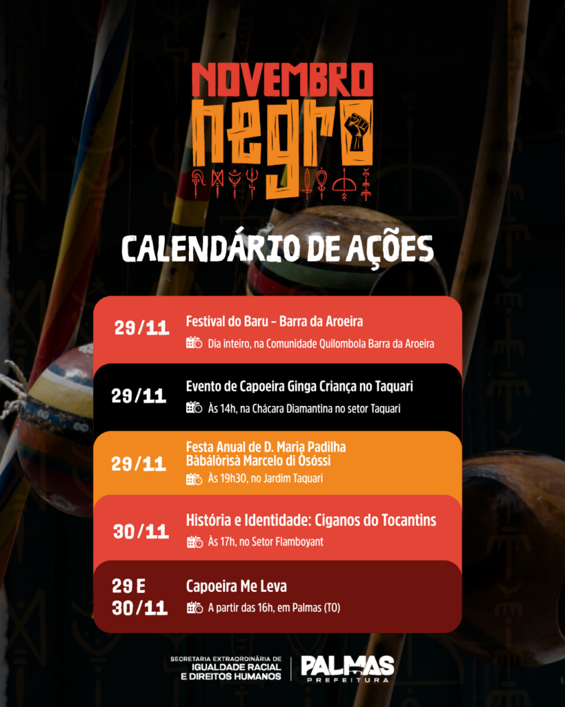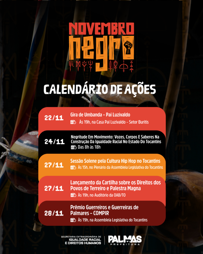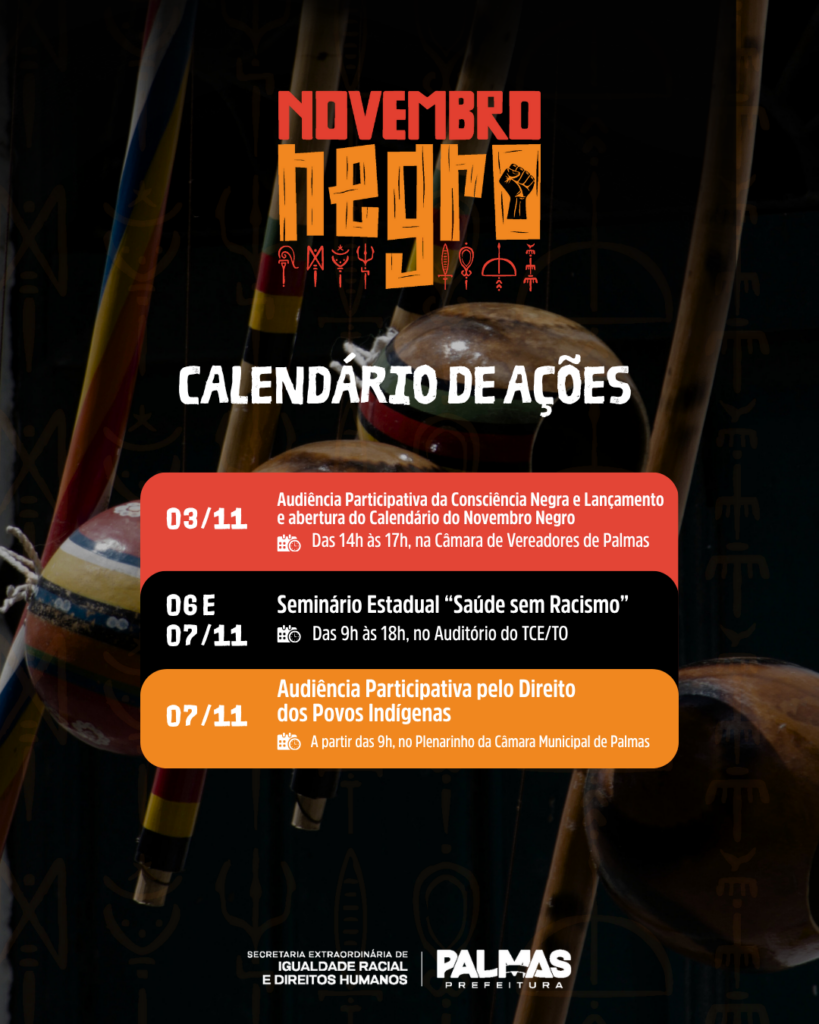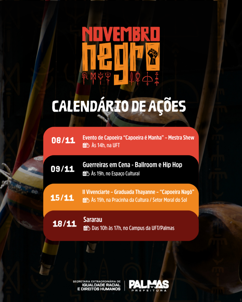 A Prefeitura de Palmas, por meio da Secretaria Extraordinária de Igualdade Racial e Direitos Humanos (Seirdh), consolidou o calendário oficial do Novembro Negro 2025, que reúne mais de 30 atividades coordenadas por 35 instituições que compõem o Comitê Municipal de Promoção da Igualdade Racial.