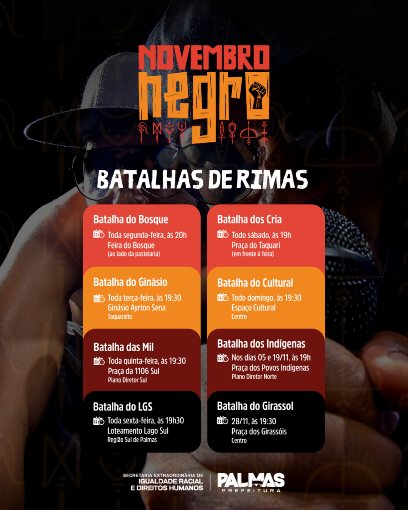 A programação teve início no dia 3 de novembro com a audiência participativa sobre Consciência Negra, realizada na Câmara Municipal, e segue até o dia 30 com atividades distribuídas em diferentes espaços públicos, instituições de ensino, centros culturais, comunidades tradicionais e equipamentos da Capital. O calendário oficial também reúne a programação fixa das batalhas de rima realizadas semanalmente na cidade, além de etapas do campeonato estadual de capoeira, feijoada do movimento negro, encontros formativos e ações de matriz africana.